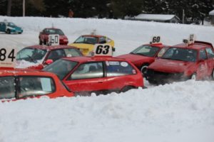 | HISTORY Ice Racing started in Ontario more than 60-years ago, and the Peterborough Motor Sports Club was one of the original organizers of the sport in the mid-1950s.Ice Racing continues as an inexpensive, fun part of the Ontario motorsport scene.The events were originally held on frozen lakes and rivers including, Chemong, Clear, and Bass in Orillia. However changes in weather patterns resulted in the Ontario championships being moved to more consistent and permanent facilities at the fairgrounds in Minden, Ontario provided by the Minden Kinsmen Club. The one km track is laid out and then repeatedly coated with water until here is a thick layer of ice between the snowbanks that delineate the course. The ice race season starts in mid to late January and runs until early March, usually consisting of six two-day events.ICE RACE COMPETITION CARS For competition purposes ice racing cars are divided into classes, all with engines up to 3000cc:RUBBER TO ICERubber-to-ice classes are restricted to un-studded tires. Other than an approved helmet, no other specialized safety equipment is required – the manufacturer’s original three-point safety harness is acceptable. In order to increase competitor participation and to further reduce the costs, there is also a ‘second driver’ series for each of the rubber-to-ice classes. This allows two drivers to compete for the entire season by sharing one race car. overall length as measured at the racetrack. CLASS 2: Front engine, front wheel drive up to 3000 cc CLASS 4: Specials, modified, and 4WD, up to 3000cc